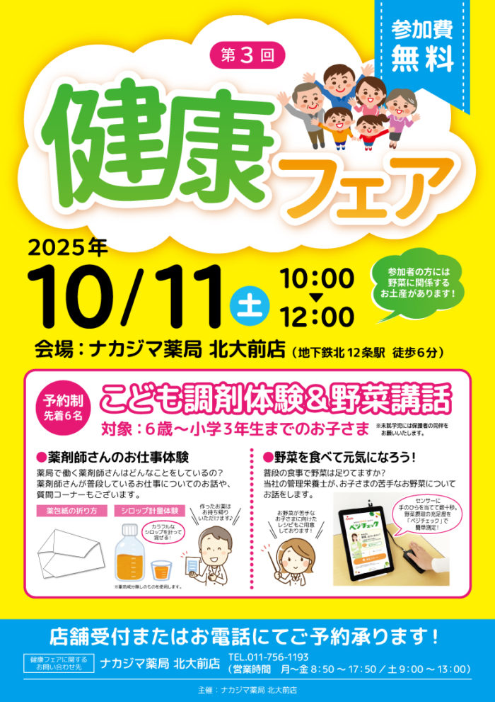 関連記事:10/11【ナカジマ薬局 北大前店】「健康フェア」開催のご案内
