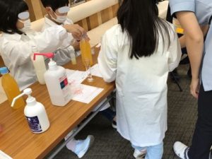 調剤体験では、当社薬剤師による「調剤薬局のお仕事」紹介やクイズのあと、ジュースを使ってのシロップ調剤や粉薬づくりを体験していただきました。