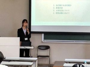 講演では、薬局管理栄養士の業務内容を中心に、国家試験への取り組み方や学生時代の経験などについてご紹介いたしました。