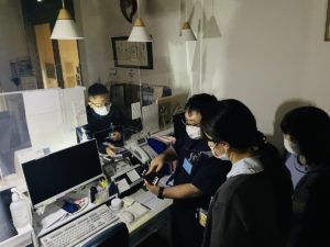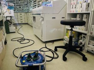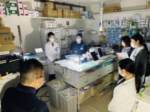 停電時を想定した訓練で、ナカジマ薬局災害救援車の発電機能を活用した調剤機器等への給電をはじめとした電源の確保、また、実際に患者様が処方箋を持って来局した場合のシミュレーション、総括などを含め、約1時間にわたって行いました。